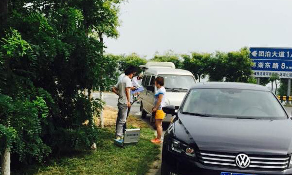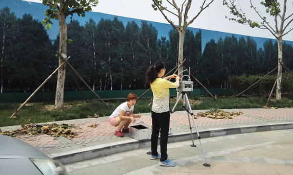 采样人员来到团泊湖附近的公路对环境空气中二氧化氮、二氧化硫进行现场采样